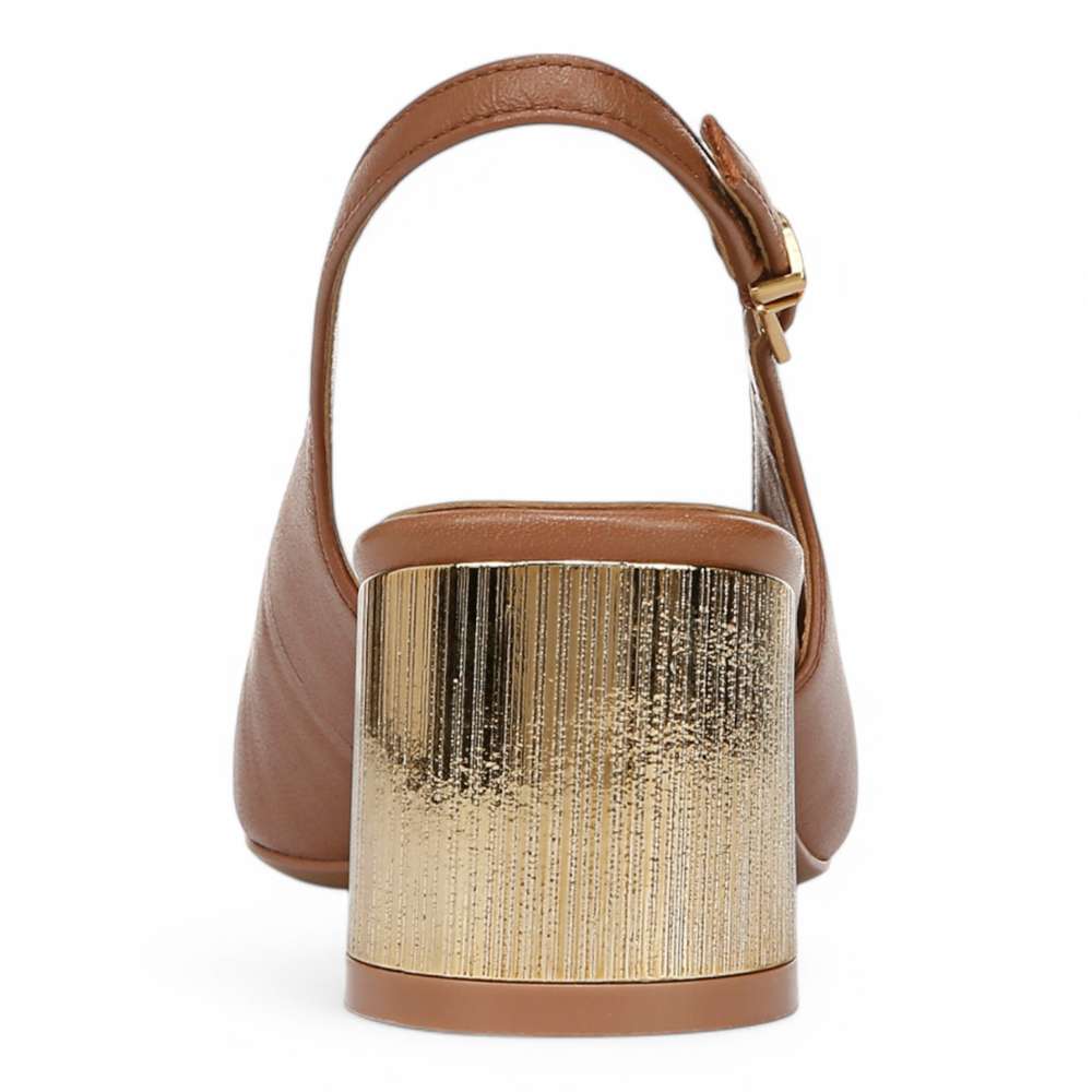 Elevate your style with the Lane Slingback. Crafted from premium leather, this chic shoe features a sleek pointed toe and a striking gold-tone block heel for a touch of sophistication. The adjustable slingback strap ensures a secure and comfortable fit, making it perfect for both day and night wear. Add a modern edge to your wardrobe with this elegant staple.